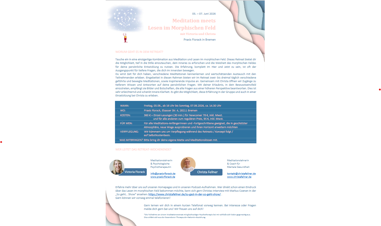 05.- 07. Juni 2026 (Fr- So): “Meditation meets Lesen im morphischen Feld”, gemeinsam mit Christa Fellner: Meditationslehrerin und Coach für mentale Gesundheit